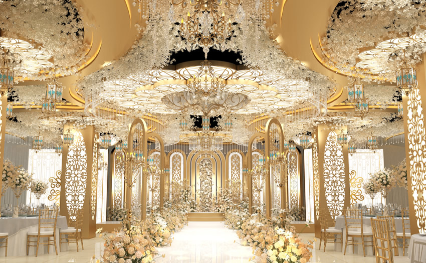 色彩和主题:为婚礼堂设定一个主题和色彩方案,这样可以使整个空间更加统一和协调。例如,可以选择浪漫的粉色或蓝色,或者传统的红色或金色。
